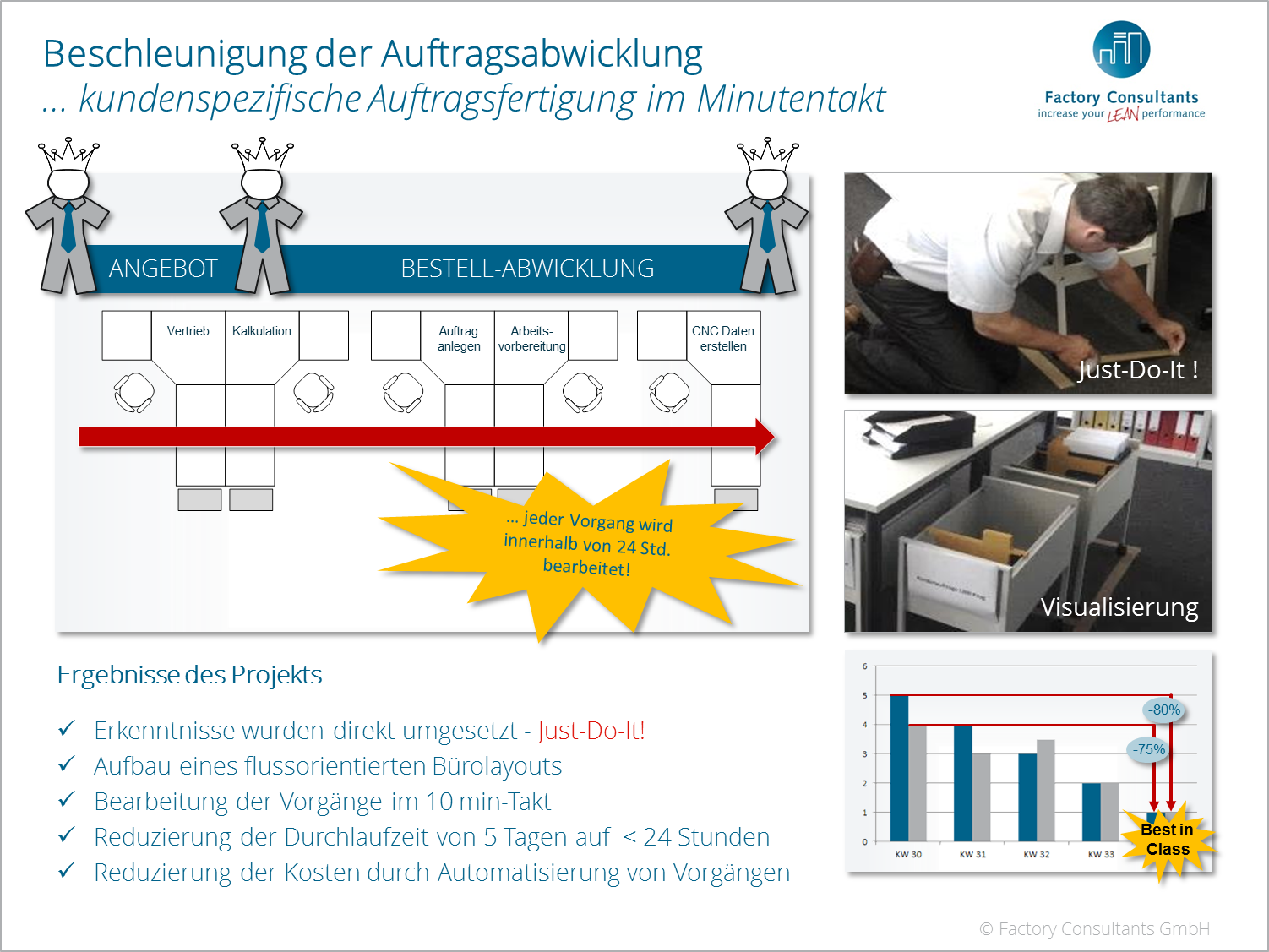 Ergebnis des Projekts war eine Reduzierung der Durchlaufzeit für alle eingehenden Anfragen und Aufträge auf weniger als 24 Stunden. Diese wurde einerseits durch die konsequente Vermeidung von Verschwendungen aber auch die Eliminierung von Wartezeiten realisiert. Das Team wurde mit Hilfe einer Qualifikationsmatrix schrittweise so qualifiziert, dass Schwankungen in den Takten problemlos geglättet und Wartezeiten vermieden werden konnten.